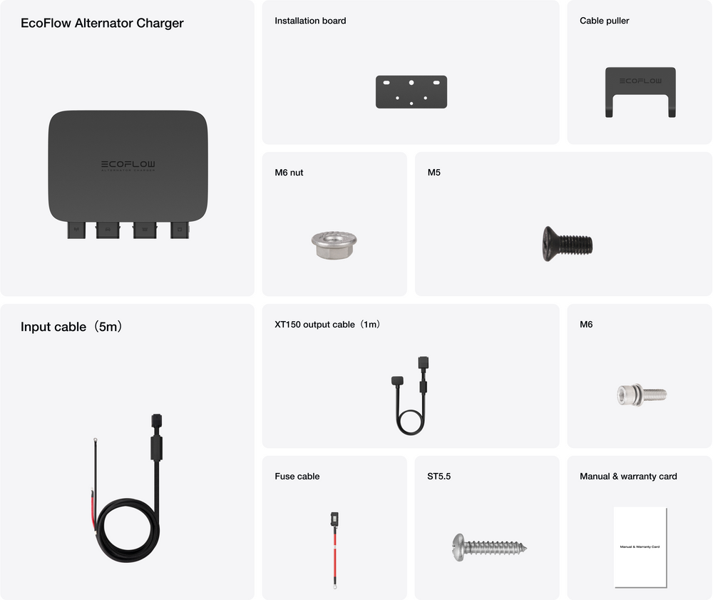 ²For the installation of the Alternator Charger, please refer to the video or illustrated installation guide provided by EcoFlow. We recommend that the wiring process be completed by a professional. Before use, please review the installation video or illustrations to ensure correct usage after full understanding. Incorrect operation of this product could result in injury or product damage and property loss. By using this product, you are deemed to have understood, acknowledged, and accepted all terms and content of this document. EcoFlow does not assume any liability for losses caused by failure to use the product according to the guidelines. Subject to compliance with laws and regulations, our company reserves the final interpretation rights for this product.