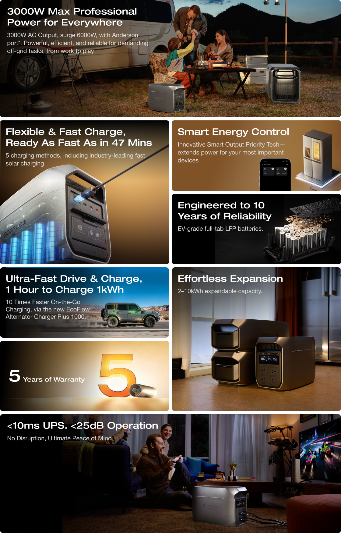 From battery chemistry to structural design, DELTA 3 Max Plus is engineered for extreme durability, environmental resilience, and whisper-quiet performance—delivering power you can count on for over 10 years.