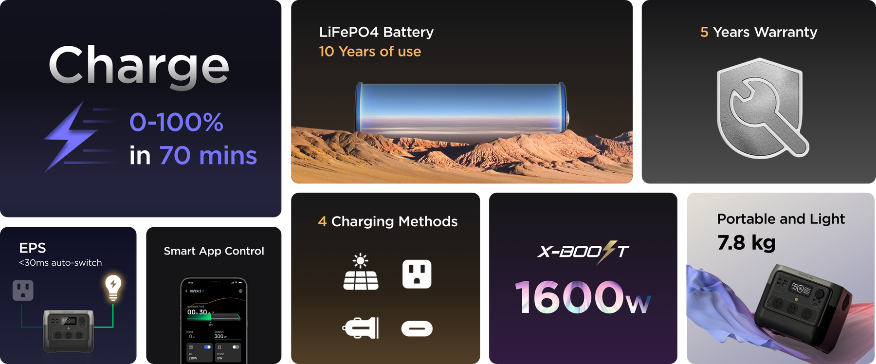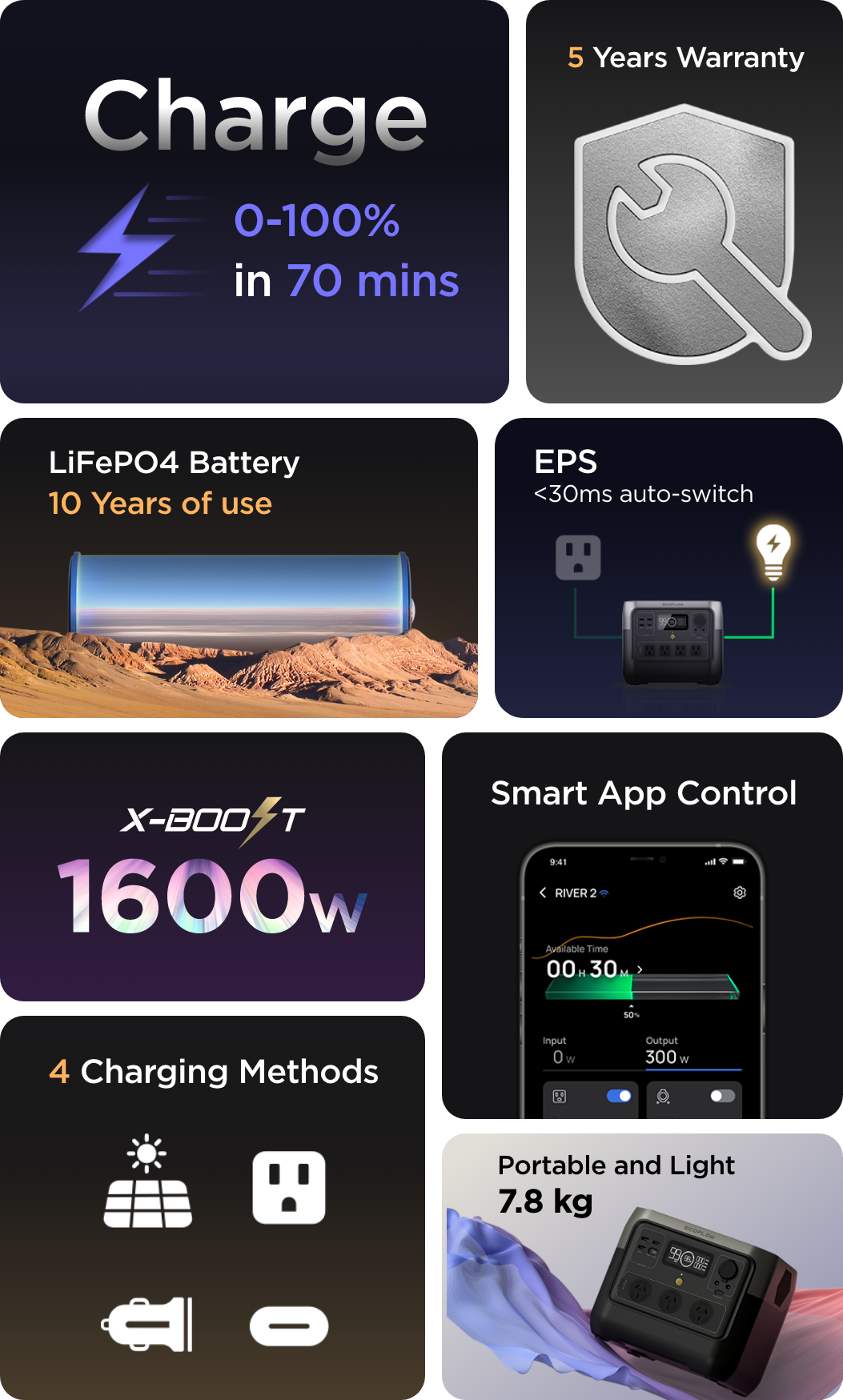 With upgraded long-lasting LFP battery chemistry at its core, charge and empty RIVER 2 Series over 3000 times. That's pretty much 10 years of everyday use1 and 6x longer than the industry average. With LFP cells, RIVER 2 Series is safe, durable, and highly efficient, even in warm temperatures.