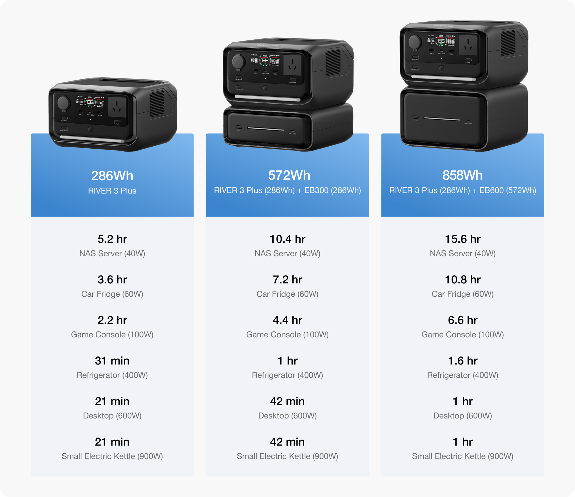Level up your RIVER 3 Plus with an Extra Battery. Choose either theEEB300 (286Wh) or the EB600 (572Wh), and simply stack one at atime to achieve up to 858Wh of pure energy.