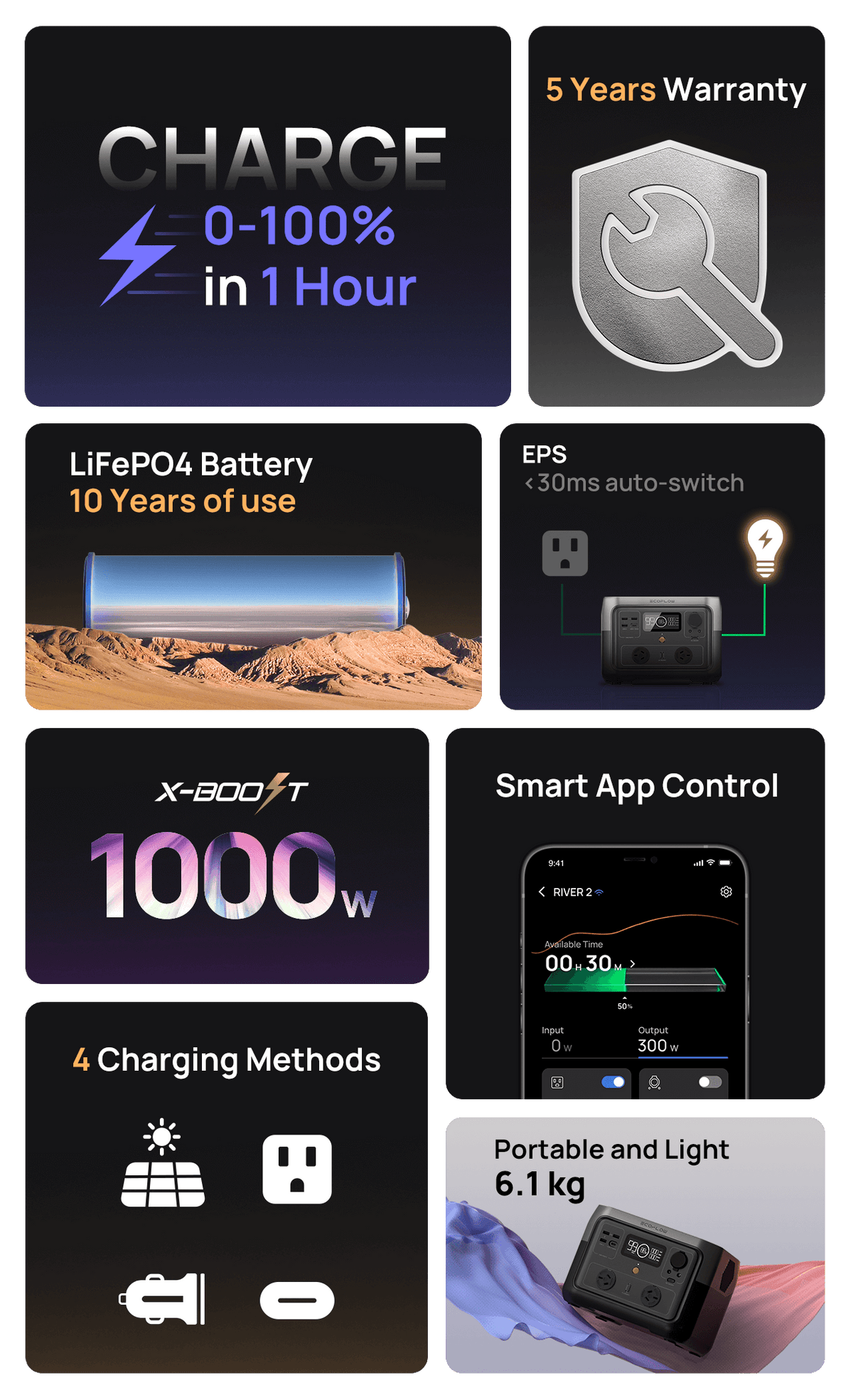With upgraded long-lasting LFP battery chemistry at its core, charge and empty RIVER 2 Series over 3000 times. That's pretty much 10 years of everyday use1 and 6x longer than the industry average. With LFP cells, RIVER 2 Series is safe, durable, and highly efficient, even in warm temperatures.