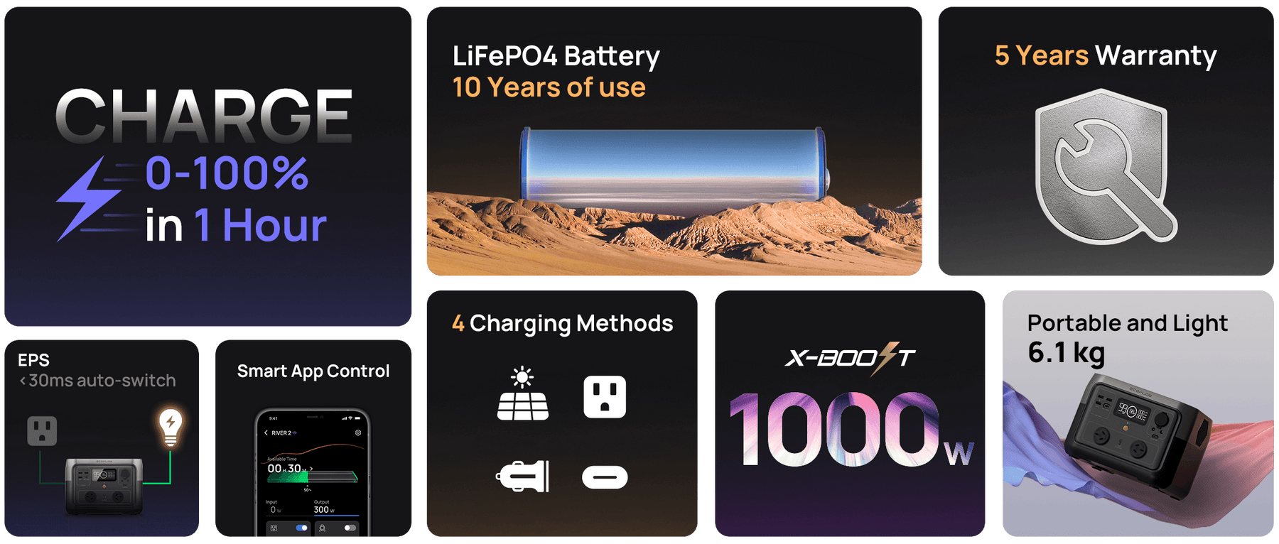 RIVER 2 Max beats the industry charging speed standard, fully charging in only 60 minutes. That's 5x faster than other portable power stations on the market and 38% quicker than previous generations. Fully charge RIVER 2 Max while you pack your bags, so you'll always be ready for a last-minute trip.
