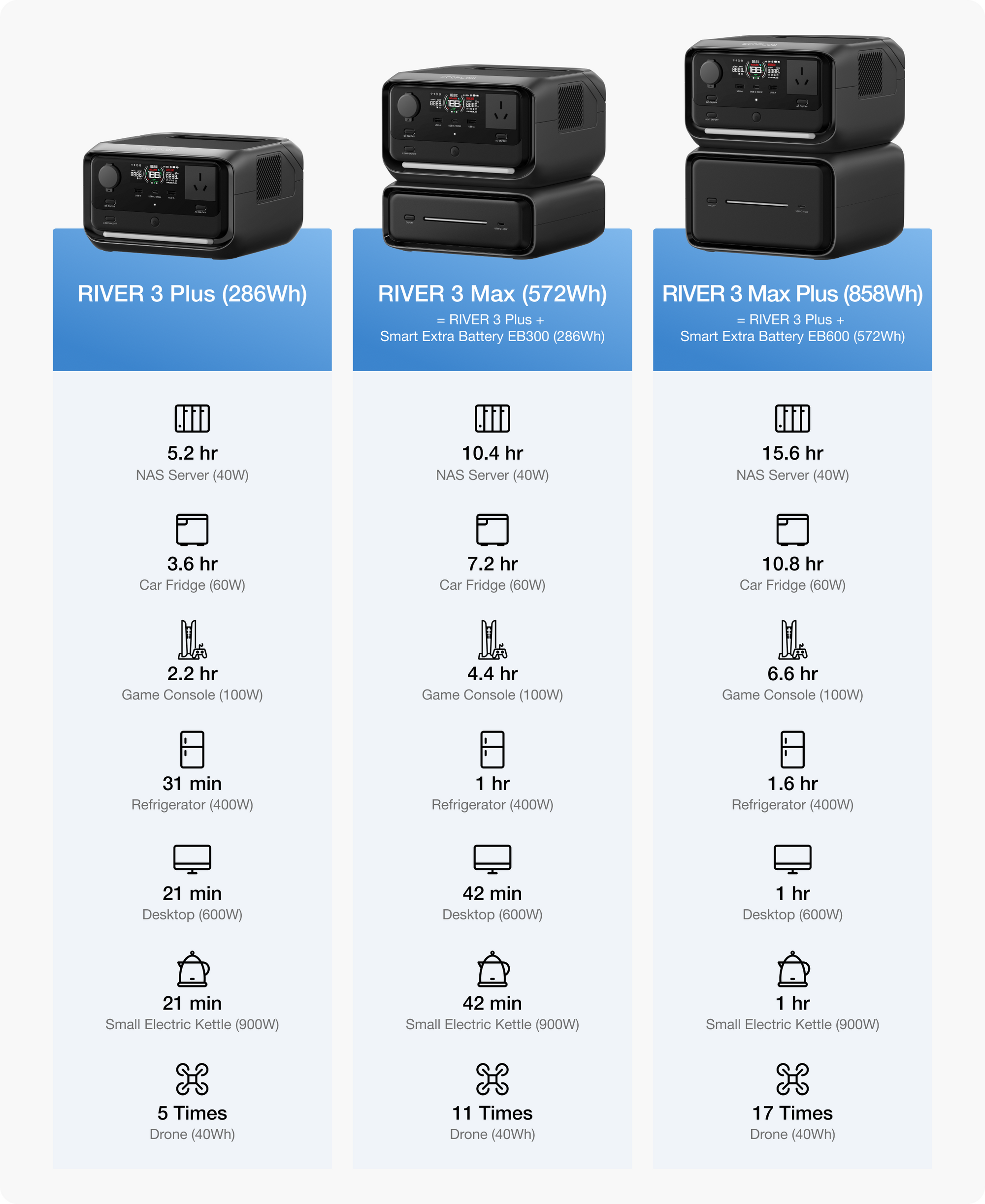 Level up your power with RIVER 3 Plus with an Extra Battery. RIVER 3 Plus can handle either the EB300 (286Wh) or the EB600 (572Wh), Just stack them to get up to 858Wh of pure energy.