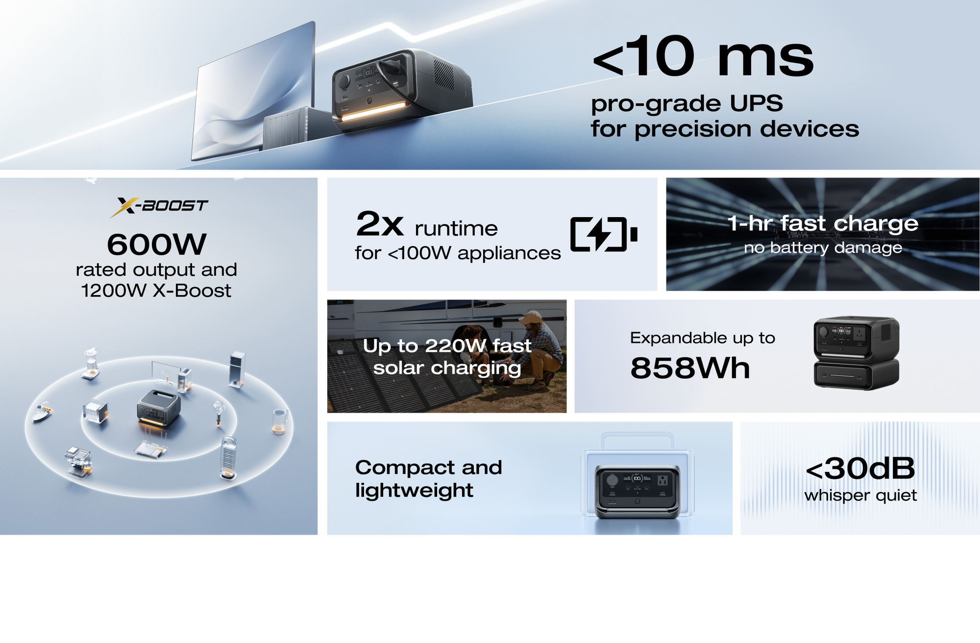 Equipped with a 858Wh capacity and 600W output, RIVER 3 Max Plus can power a 3W Wi-Fi router for up to 86.9 hours. Plus, it can run pretty much any office appliance, including 600W computers for at least 60 minutes, allowing a safe shutdown and completion of ongoing tasks.