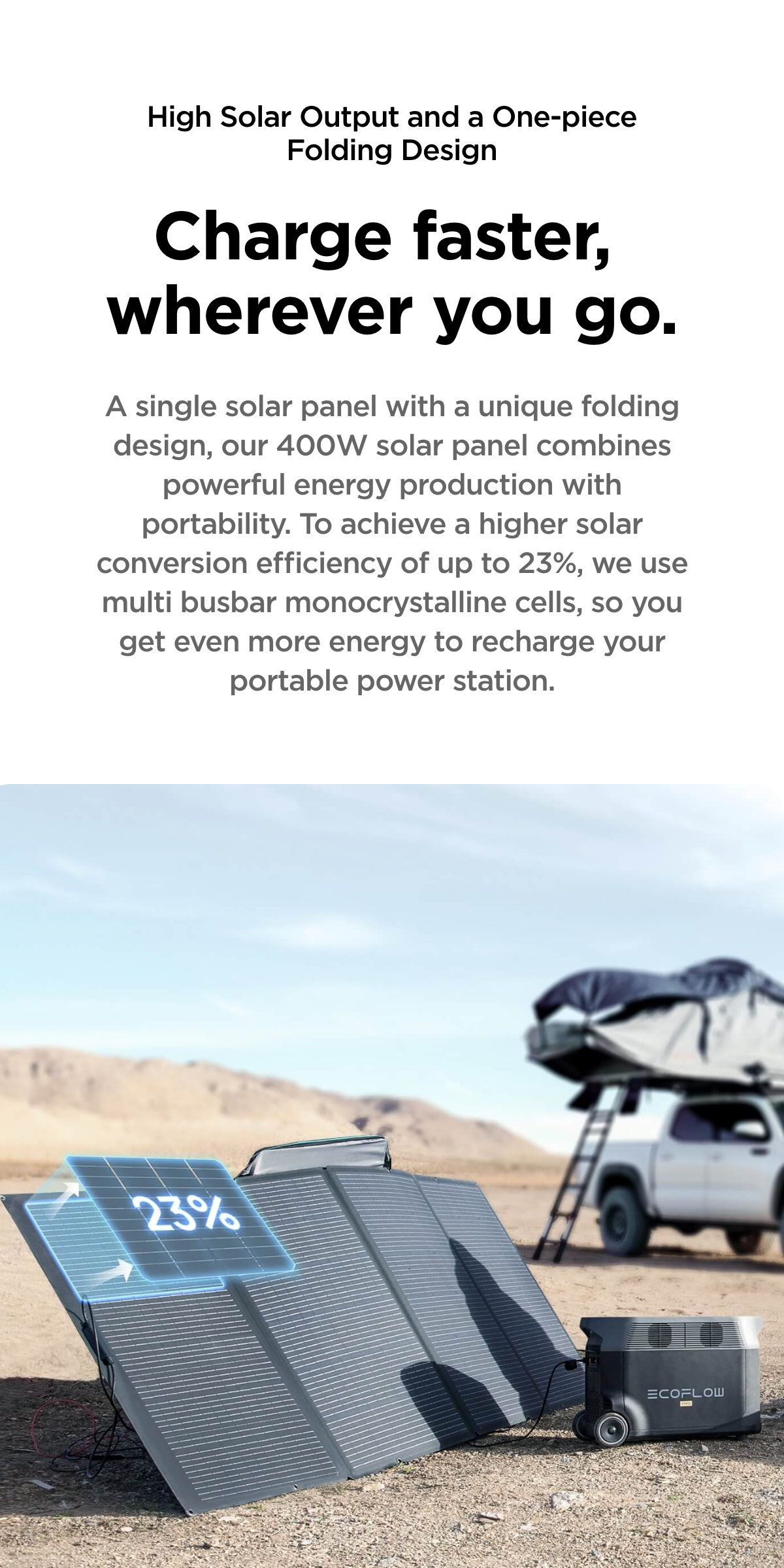 Our 400W portable solar panel offers high solar output, conversion efficiency rating, and a convenient folding design so it’s ready to grab and go at any time.