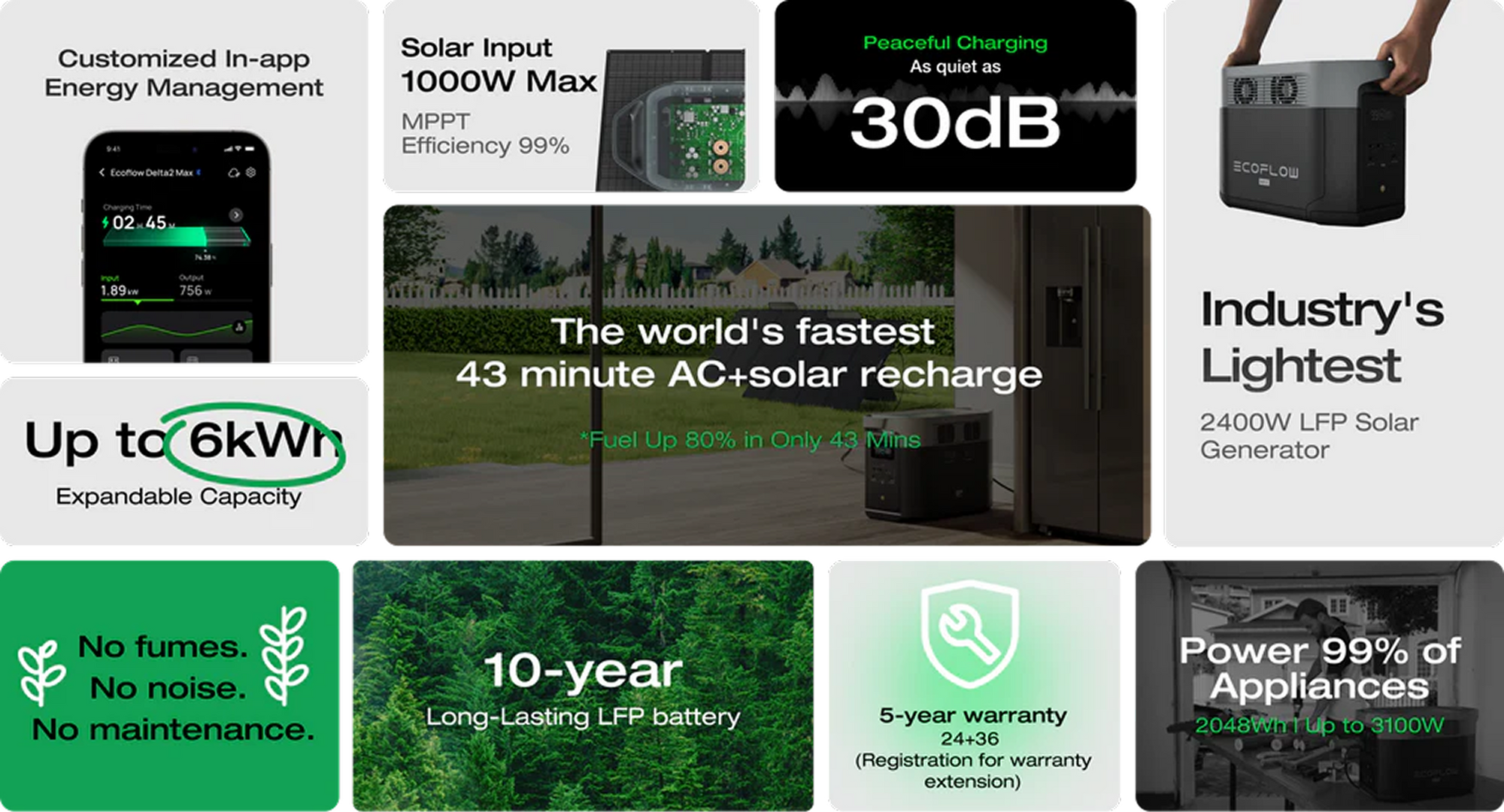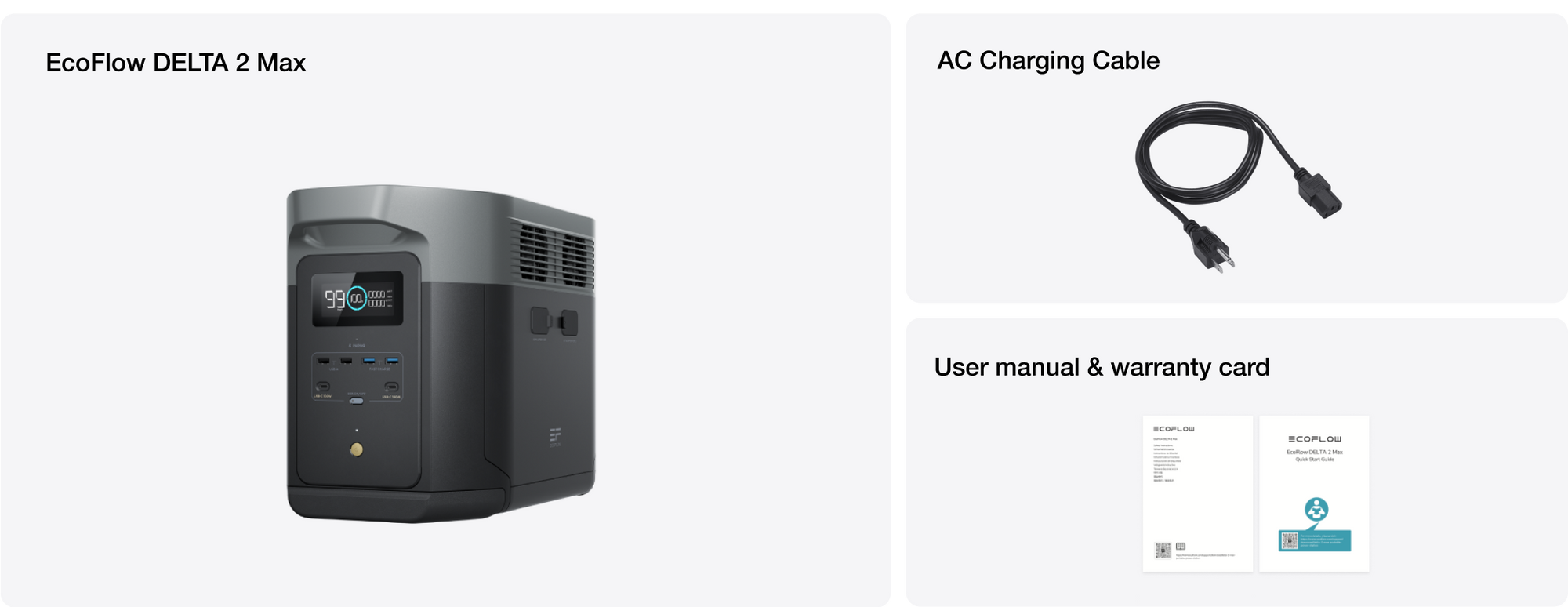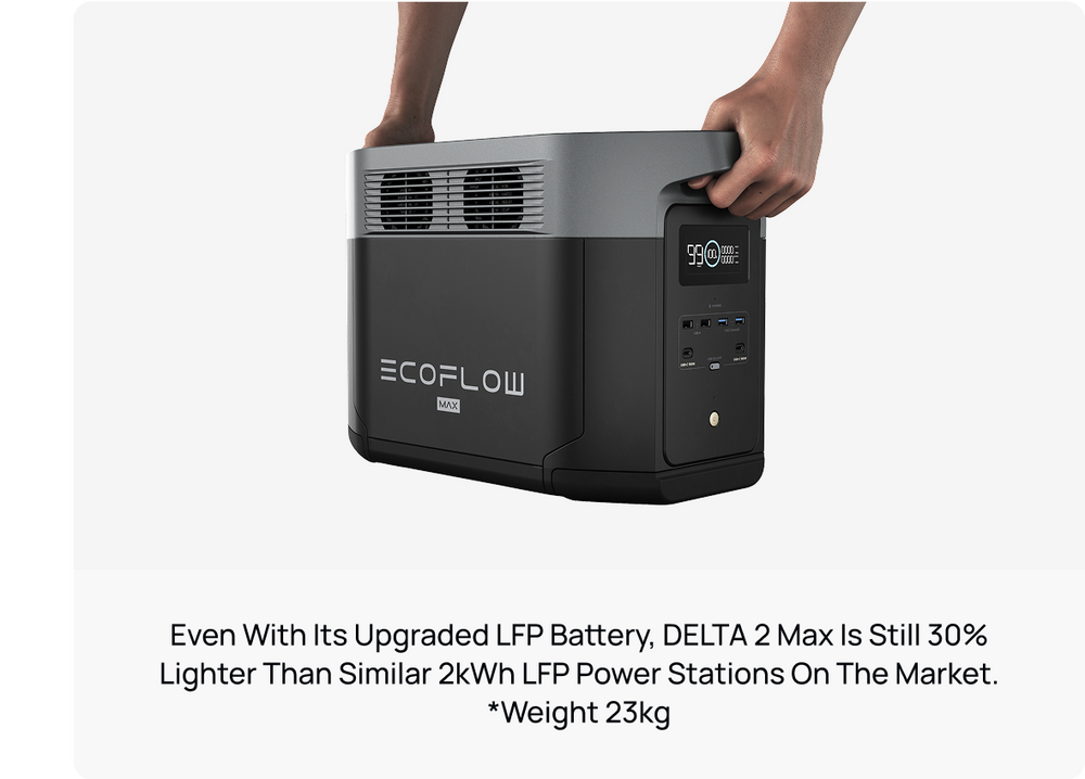 A generous 2048Wh capacity makes DELTA 2 Max ideal for home backup, running your essentials for hours. Take DELTA 2 Max with you anywhere as a solo unit or connect it with two Extra Batteries for up to 6kWh of home backup.With its lightweight design, DELTA 2 Max is portable enough to grab and go on the next camping trip.