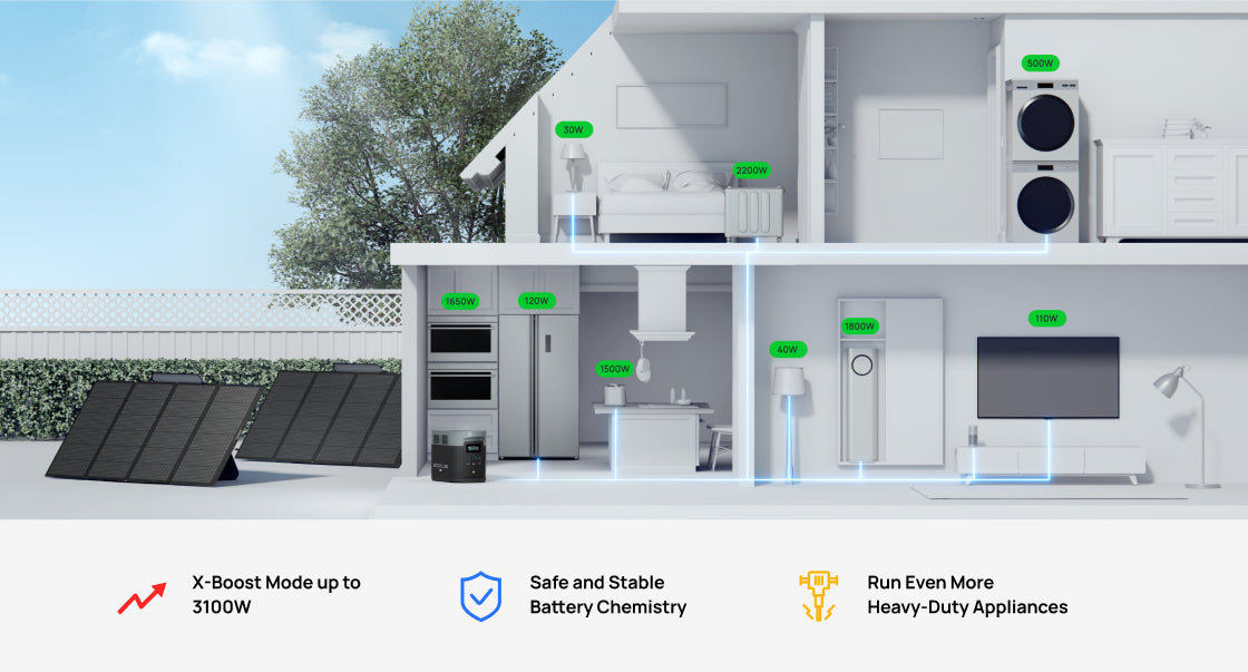 Huge AC output: With X-Boost mode, get up to 3100W output power to run 99% of home appliances. Power 13 devices at once, including 4 AC outlets.