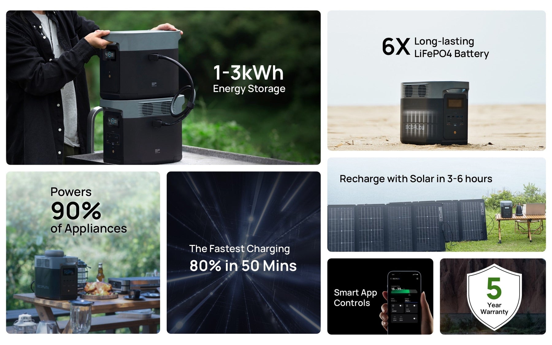 Pair with solar panels and charge in as fast as 3-6 hours with 1x400W, 2x220W portable solar panels. With its MPPT (Maximum Power Point Tracking) smart algorithm, DELTA 2 can actively detect the voltage and current in real-time to reach the maximum power point with >98% efficiency. That means a more efficient charge than other brands.