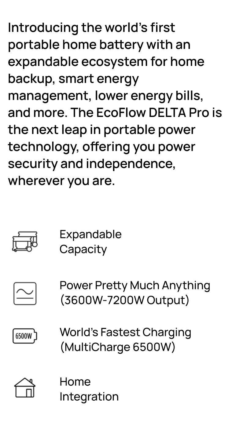 The EcoFlow DELTA Pro ecosystem stores energy day and night, reducing your reliance on the grid and lowering your energy bills by combating time-of-use rates. It integrates directly with your home using the EcoFlow Smart Home Panel. The EcoFlow app gives you a smart breakdown of your energy habits, and you can customize your energy usage for any type of situation.