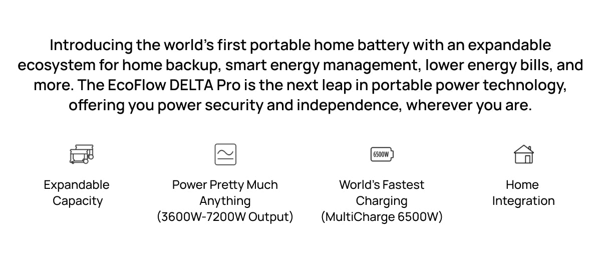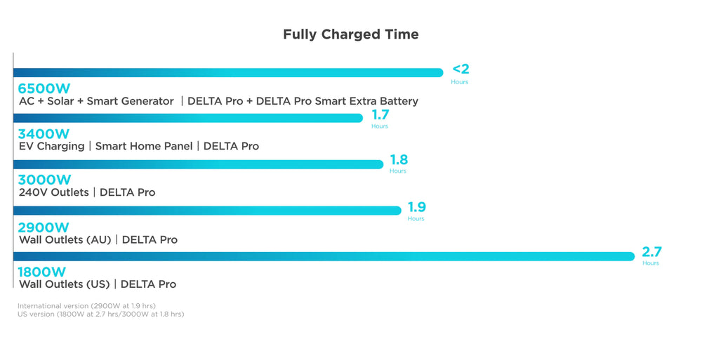 When charging DELTA Pro and its extra battery together, you can reach 6500W max charging speeds by combining AC, solar and Smart Generator methods. For DELTA Pro single unit, you can recharge it at standard wall outlets (2900W max), at EV station (3400W max)/Smart Home Panel (3400W max).