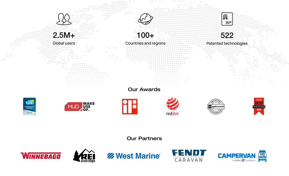 EcoFlow is sold in more than 100 countries and regions, with a user base of 3,000,000+ worldwide. Our products are at the forefront of industry technology and have been certified and affirmed by tech media and awards. We are authorized as official strategic partners by major RV and outdoor industry companies.