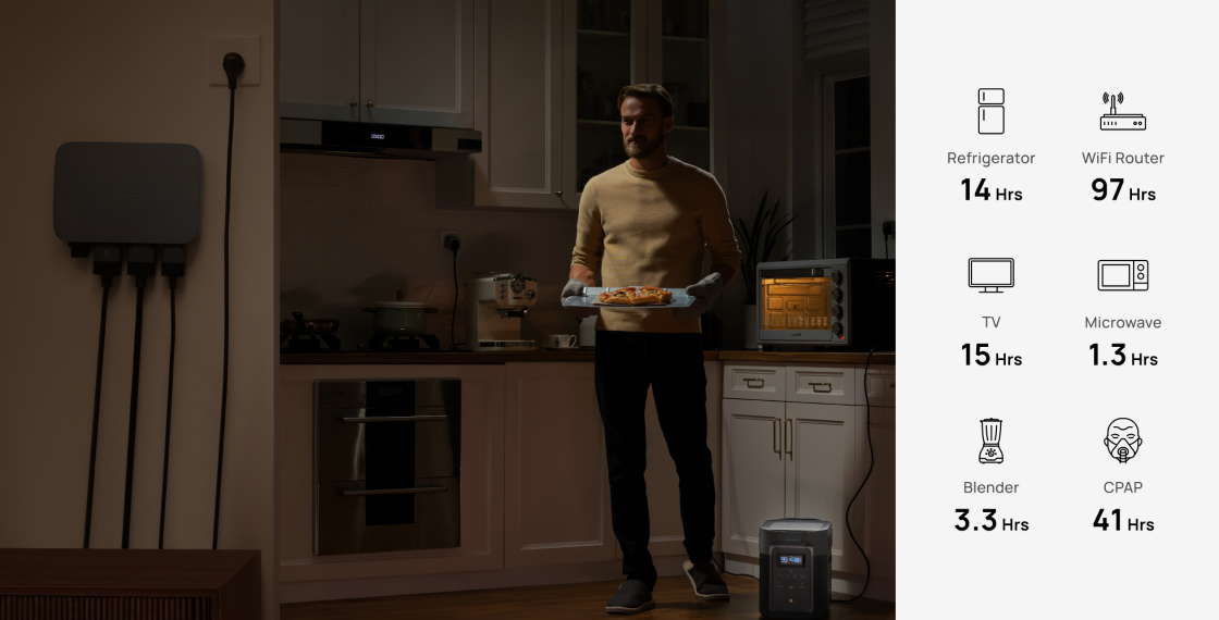 Power your essential appliances with a hefty 2400W AC output by connecting DELTA 2 Max (2kWh) and up to two Smart Extra Batteries (6kWh) with your home's transfer switch for partial home backup. With a plug-and-play design, it's easier than ever to prepare for blackouts.