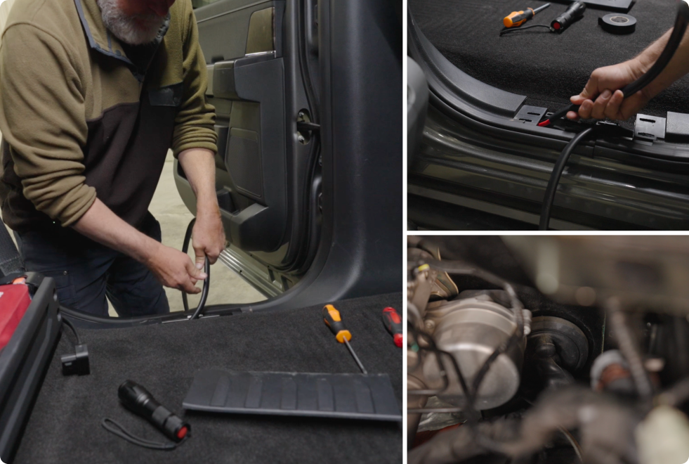 Thread the other end of the input cable through the car body towards the charger. If the input cable is bulky or difficult to pull through, disconnect the cable ends before threading.