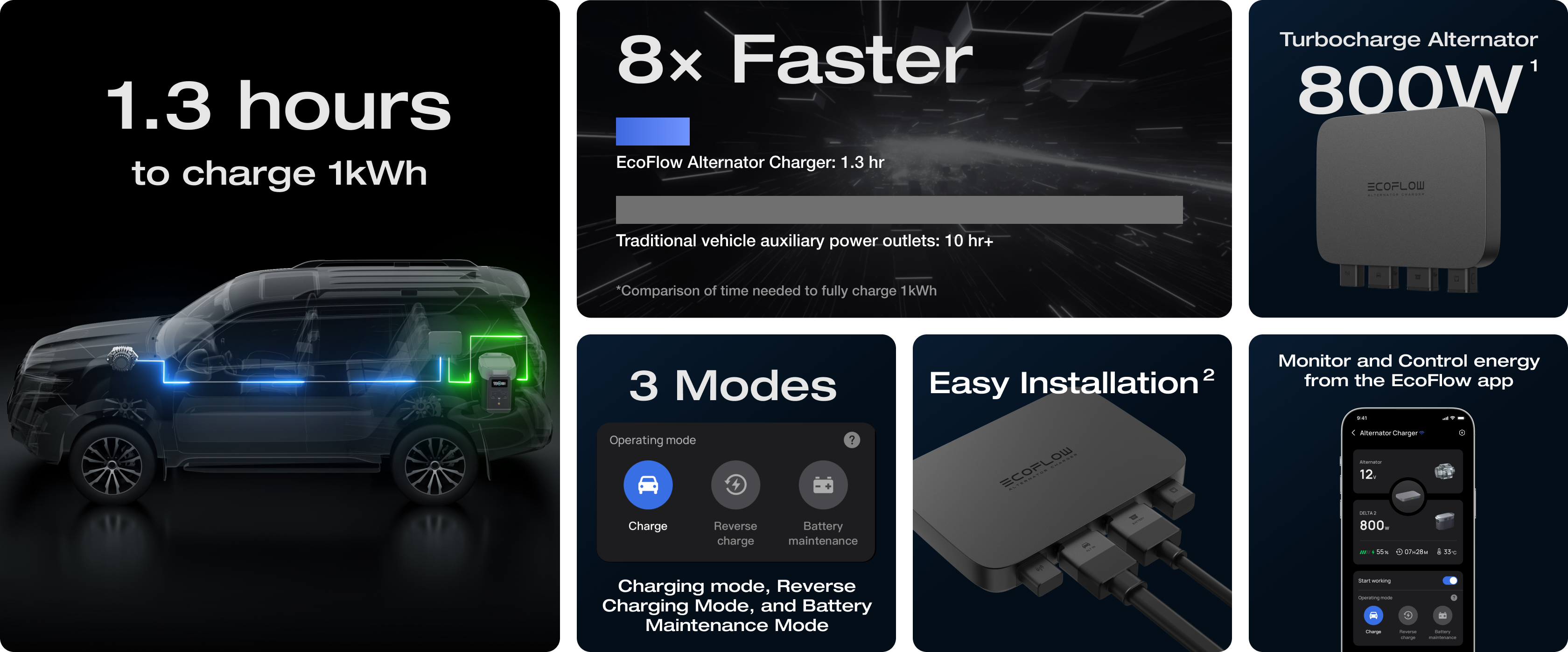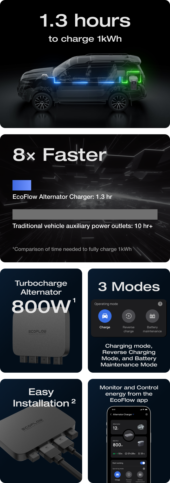 Charge 8× faster while you drive with our EcoFlow 800W Alternator Charger and recharge your power station in only 1.3 hours.