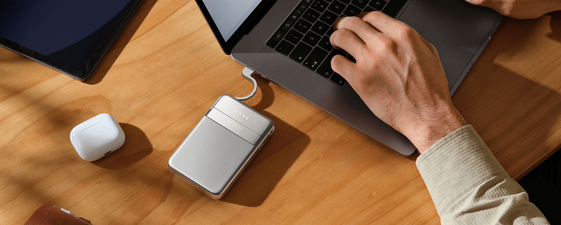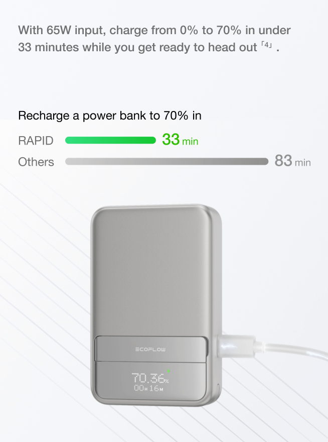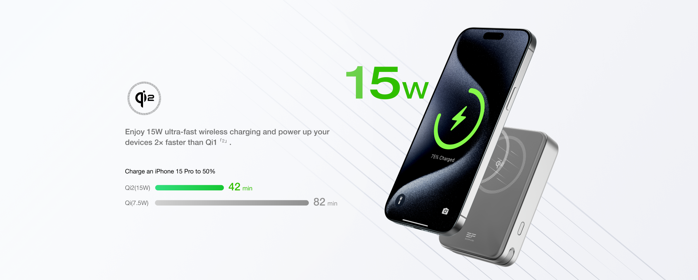 RAPID uses patented X-Stream technology for flagship smartphone-level energy density and fast charging capability. Plus, it works with the PD3.0 protocol for flash charging and recharging. Paired with Qi2-certified wireless charging and a built-in cable design, RAPID ensures snap-on charging convenience with maximum charging speeds.