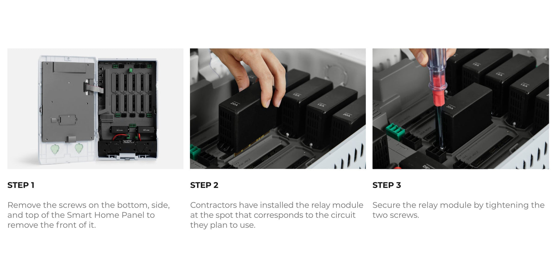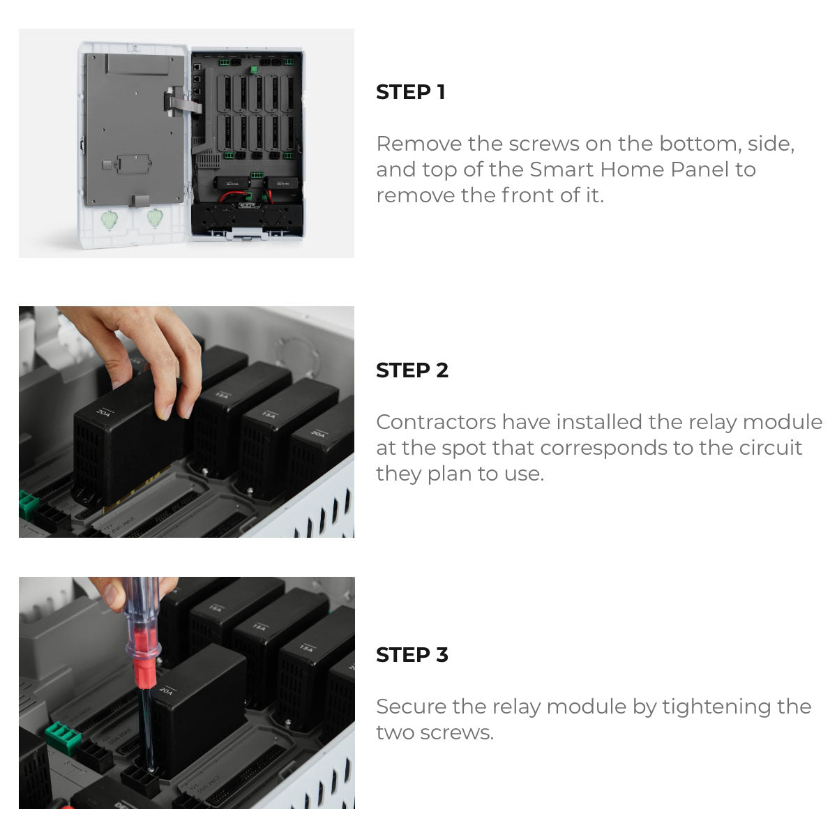 -Determine the relay modules needed: Choose the relay module that matches the current rating for the circuit breaker upstream of that load circuit. Recommended relay modules for regions: 15A, 20A, 30A for US and Japan.