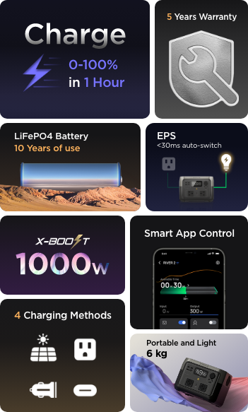 With upgraded long-lasting LFP battery chemistry at its core, charge and empty RIVER 2 Series over 3000 times. That's pretty much 10 years of everyday use1 and 6x longer than the industry average. With LFP cells, RIVER 2 Series is safe, durable, and highly efficient, even in warm temperatures.
